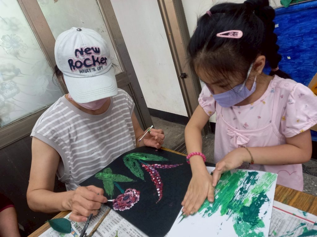 之後,孩子和長輩們各自拿起棉花棒,沾上繽紛的顏料 🎨✨,一點一點地在畫紙上勾勒出花朵的形貌。紅的、黃的、紫的……隨著點點顏料的堆疊,一朵朵色彩鮮豔、獨一無二的花朵慢慢綻放。