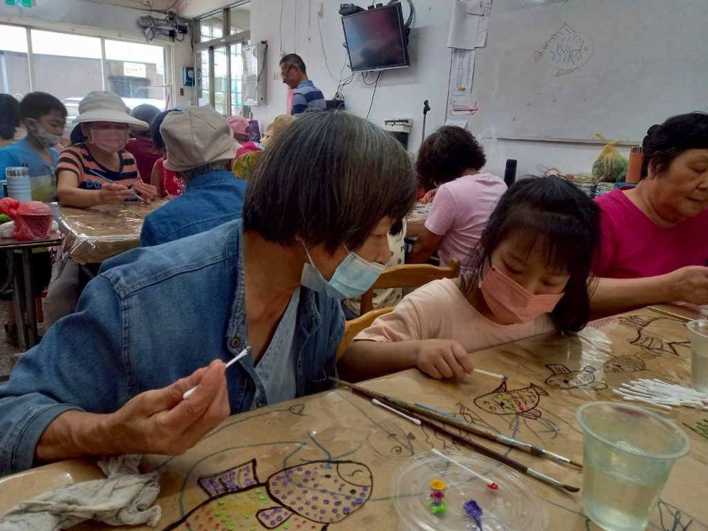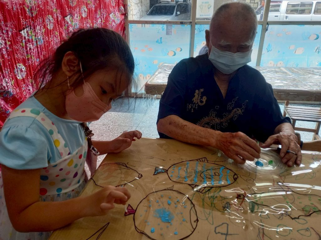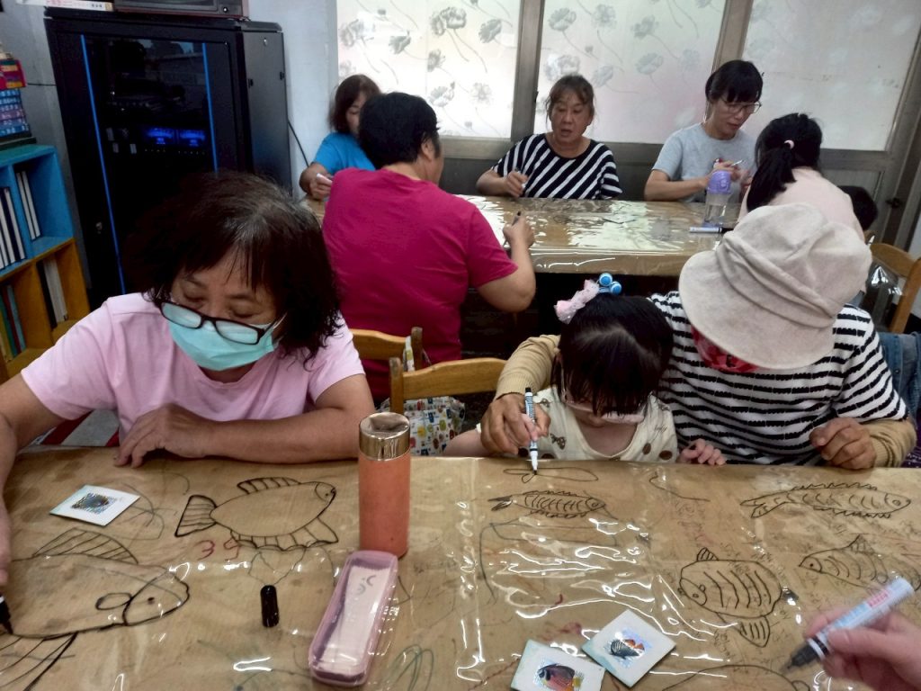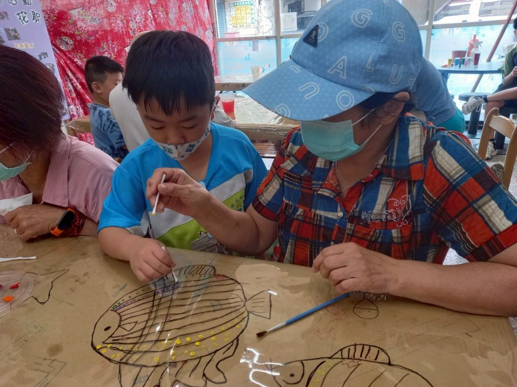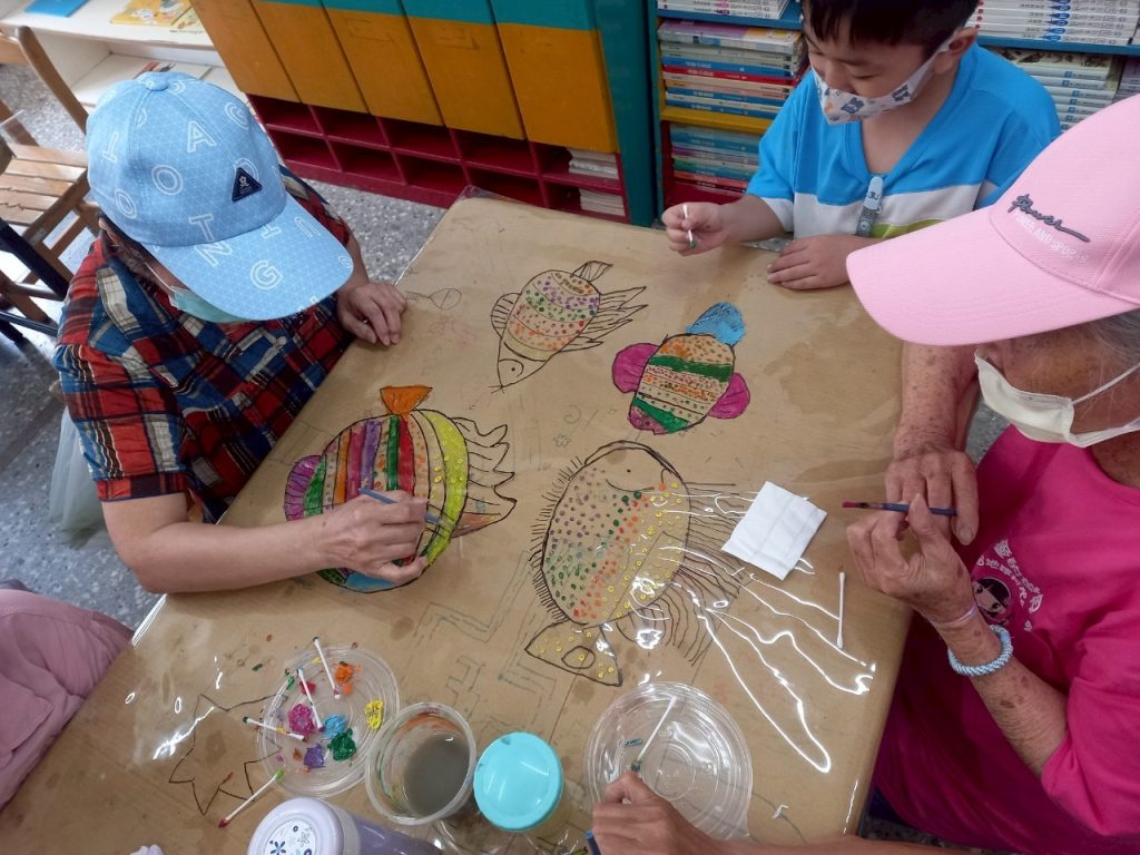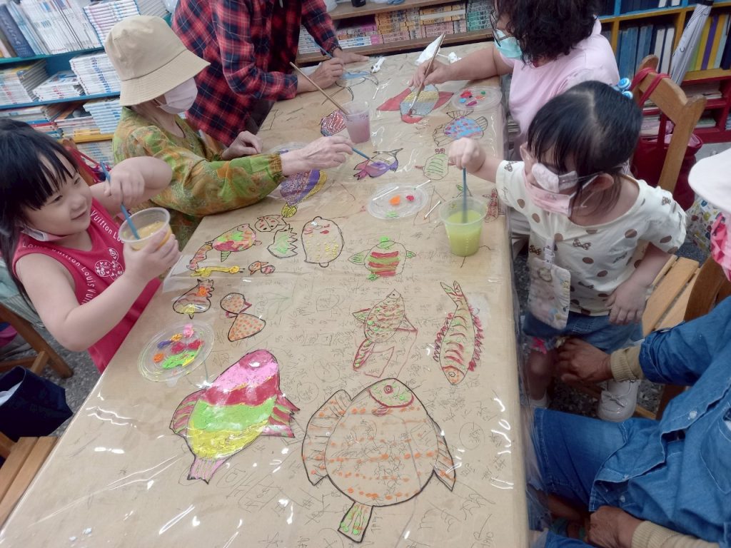 在過程中,孩子們會幫忙準備顏料、拉穩桌布,長輩則引導孩子如何上色、怎麼讓圖案更完整。討論聲與笑聲此起彼落,就像魚兒在水裡悠游般熱鬧。