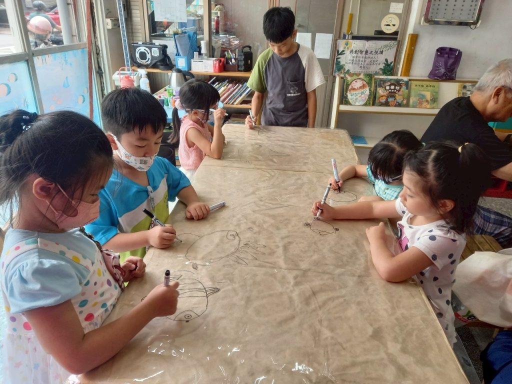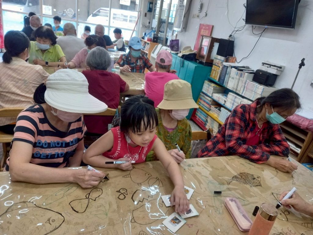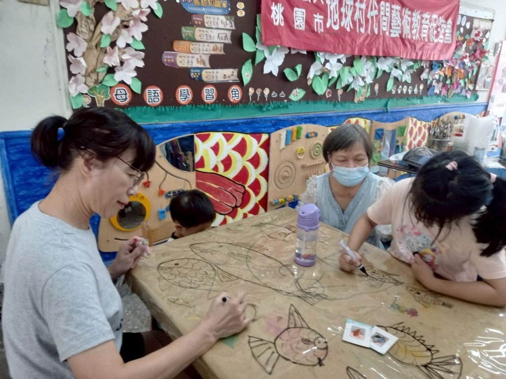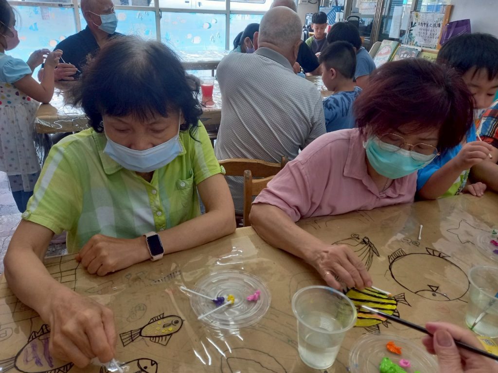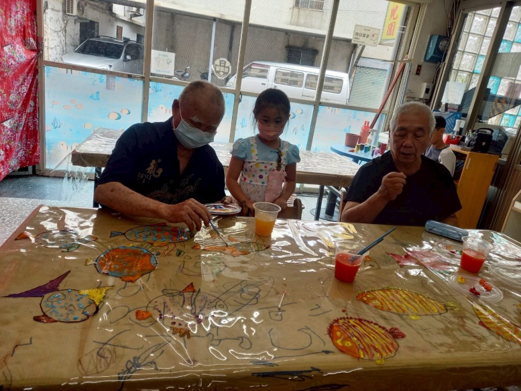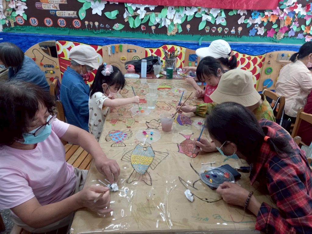 在過程中,孩子們會幫忙準備顏料、拉穩桌布,長輩則引導孩子如何上色、怎麼讓圖案更完整。討論聲與笑聲此起彼落,就像魚兒在水裡悠游般熱鬧。