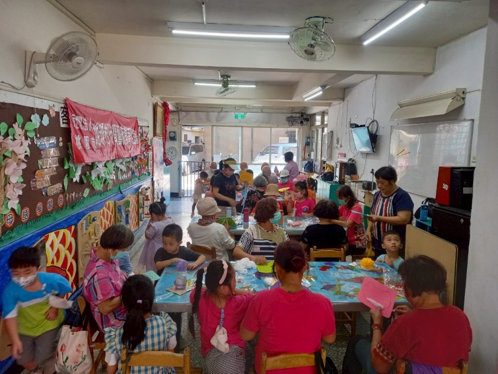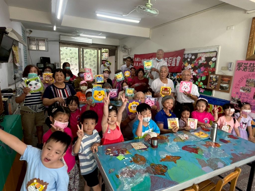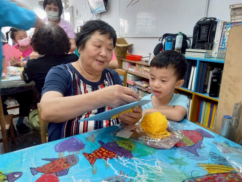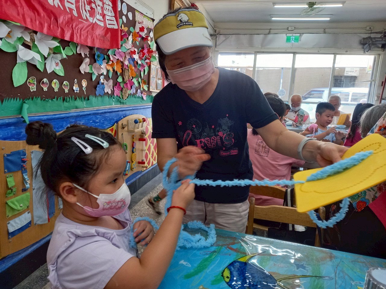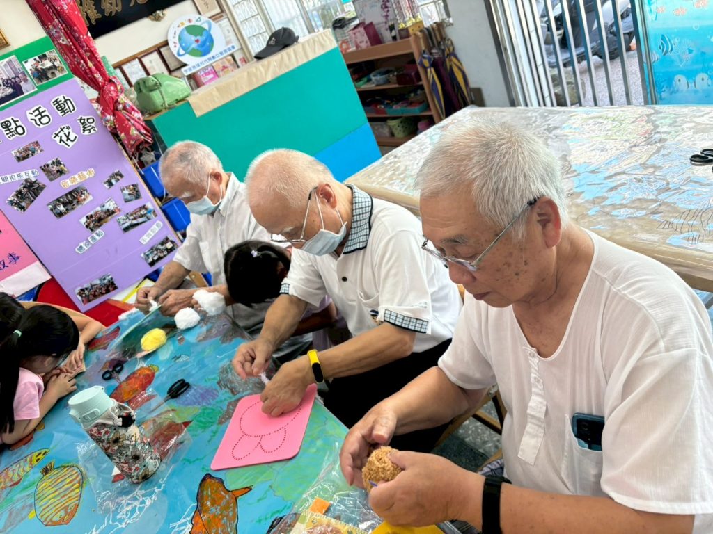 👧 孩子們在旁邊也沒有閒著——有的貼心幫忙拿著毛線的另一端,有的幫忙穿線,還有人專心地把針線拉到另一邊,讓阿公阿嬤能更順利完成作品。這一來一往的合作,不僅讓作品更快完成,也讓教室裡充滿了笑聲與溫暖。
